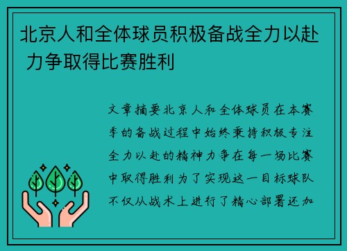 通过本文的阐述,我们可以看出,北京人和全体球员在积极备战过程中,从战术布局、个人能力提升、心理调节到长远规划等多个方面,均做出了精心准备。每一个环节的细致打磨,都是球队全力以赴、力争胜利的体现。球队的整体战术部署使得每一位球员都能在比赛中找到最合适的角色与定位,而球员的个人能力提升和团队协作的增强,进一步保证了球队在比赛中的高效运作。
