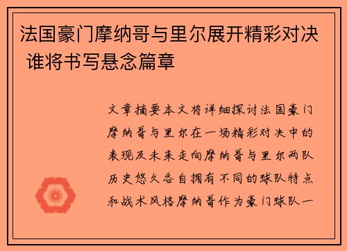 文章摘要:本文将详细探讨法国豪门摩纳哥与里尔在一场精彩对决中的表现及未来走向。摩纳哥与里尔两队历史悠久,各自拥有不同的球队特点和战术风格。摩纳哥作为豪门球队,一直以来以其强大的进攻体系著称,而里尔则以坚实的防守和高效的反击为其立足之本。两队的对决不仅是一场技术与战术的碰撞,更是对球员个人能力与团队协作的深刻考验。文章将从战术层面、球队状态、关键球员表现以及比赛影响四个方面展开详细分析,尝试揭示这场精彩对决背后的悬念和可能的结果。通过全方位的分析,本文旨在为读者呈现摩纳哥与里尔对决中的精彩瞬间和未解之谜,探索最终谁将书写胜利篇章。